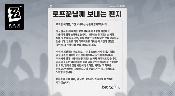 또한 수정과 개선에는 어느정도 시간이 소요되기에 조금만 기다려 달라는 양해의 말을 전하기도 했다. 개발진 일동은 "'젠레스 존 제로'는 마치 자식과도 같다. 우리의 목표는 유저들의 마음에 드는 이상적인 '젠레스 존 제로'를 만드는 것이다. 많은 시간이 걸리더라도 유저 기대에 부응하기 위해 지속적으로 노력하겠다"고 전했다.