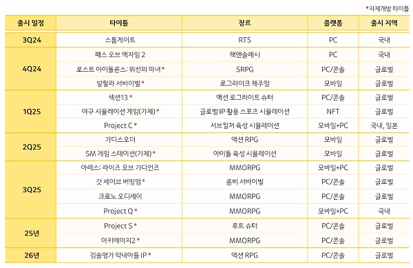 글로벌 장르 다양화의 초석이 될 게임으로 기대 중이며, 이중 ‘로스트 아이돌론스’는 4분기 글로벌 출시를 예정하고 있다. 또한 라이온하트스튜디오가 개발 중인 로그라이크 캐주얼 게임 ‘발할라 서바이벌’도 4분기에 글로벌 출시한다.