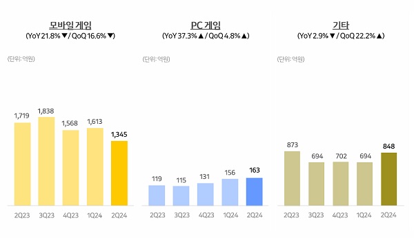 매출 중 모바일 게임은 1,345억 원으로 전년 동기 대비 약 22%, 전분기 대비 약 17% 감소했다. 신작의 성과 부재 및 장기 서비스 타이틀의 매출 자연 감소 때문이다.