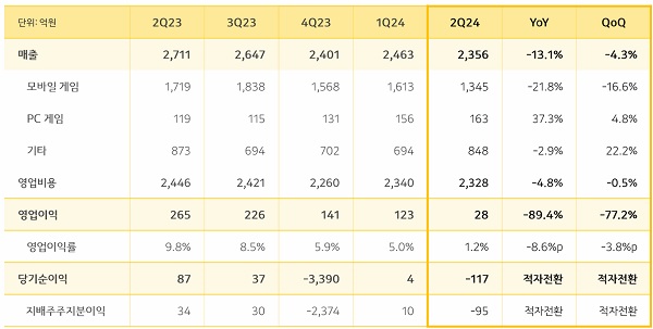 8월 7일 카카오게임즈가 발표한 2024년 2분기 실적에 따르면 매출은 2,356억 원으로 전년동기대비 13%, 전분기 대비 4% 감소했다. 영업이익은 약 28억 원으로 전년 동기 대비 약 89%, 전분기 대비 약 77% 감소했다. 당기순손실은 117억 원으로 적자전환했다.