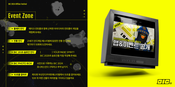 BIC 페스티벌 2024는 10회를 기념하여 다양한 특별 이벤트를 준비하였다. ‘BIC 10 라운지(BIC 10 Lounge)’에서는 BIC 페스티벌 10회까지의 여정을 되돌아보는 전시가 이루어지며, ‘레전드 인디’ 코너에서는 10회까지의 어워드 수상작들을 한자리에서 만날 수 있다. 또한, 참관객들이 직접 참여할 수 있는 체험 이벤트도 마련되어 있다. 정확히 10초를 맞춰야 하는 '10초를 잡아라'와 제기차기 10회 시 선물을 증정하는 '전통 인디' 등 다양한 즐길거리로 오프라인 페스티벌 참관객들을 맞이할 준비를 하고 있다.