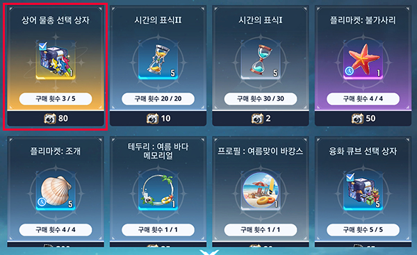 따라서, 최대 5개 구매할 수 있는 상어 물총 선택 상자는 여러 가지 물총을 뽑기보다는 한 종류 물총에 투자하는 편이 좋다. 한 가지 물총을 5개 얻은 후 진화까지 진행해 더 막강한 무기로 만드는 것을 추천한다.
