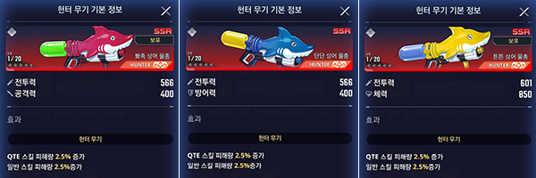 각각의 상어 물총은 각 능력에 맞춰 적합한 헌터에게 장착해야 더 높은 효과를 발휘할 수 있다. 공격, 방어, 체력으로 구분되는 헌터의 타입은 스킬 항목에서 일반 공격을 보면 쉽게 알 수 있다.