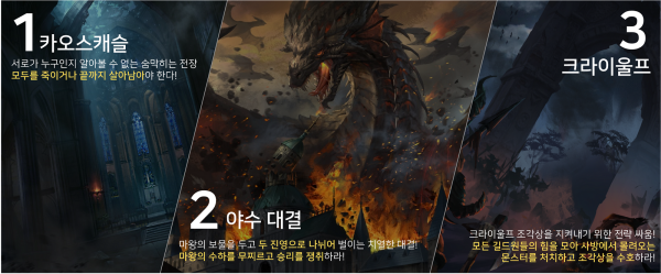 유저들로부터 가장 기대되는 콘텐츠로 손꼽힌 '야수대결'은 마왕의 보물을 두고 두 진영으로 나뉘어 벌이는 보물 쟁탈전 성격의 콘텐츠다. 그 밖에도 익명 전장을 연상시키는 '카오스 캐슬'과 디펜스 게임 성격의 '크라이울프' 등을 선보인다.