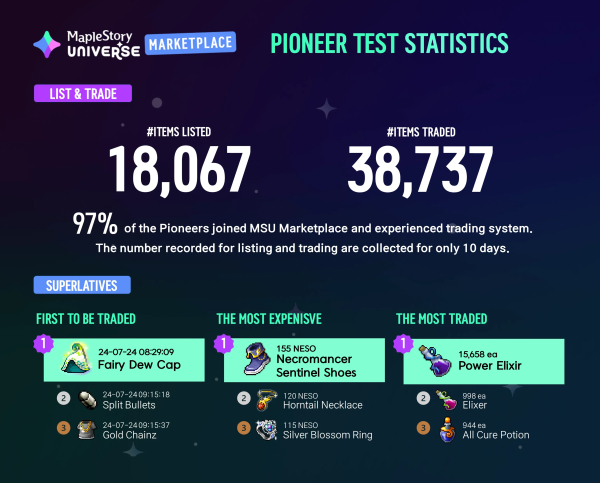 테스트 기간동안 마켓플레이스를 통해 등록된 아이템은 18,067개였으며, 거래는 38,737건이 이뤄졌다. 그리고 참여 유저의 97%가 마켓플레이스에 가입해 거래 시스템을 경험한 것으로 나타났다.