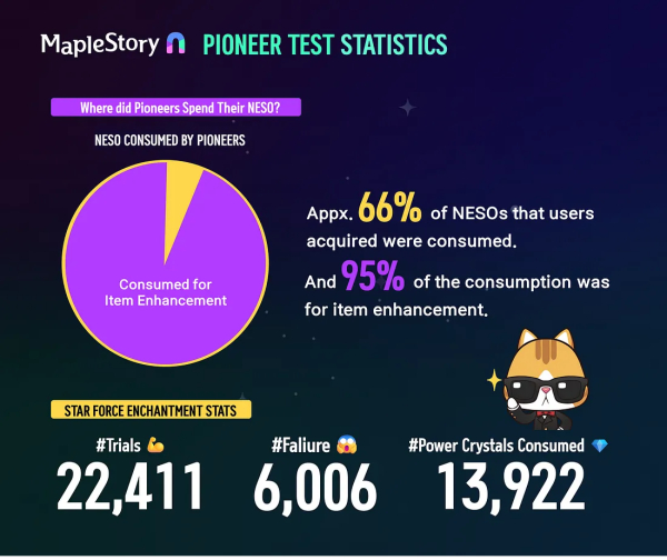또 테스트 기간 동안 토큰 재화인 네소의 총 소모량은 28573.106103이었다. 이는 전체 유저가 획득한 네소의 66%에 해당하며, 이중 95%는 아이템 강화에 사용됐다. 그리고 스타포스 강화는 22,411번이 시도되었으며, 그중 6,006번의 실패가 있었다. 이를 통해 파워 크리스탈이 13,922개가 소모된 것으로 나타났다.