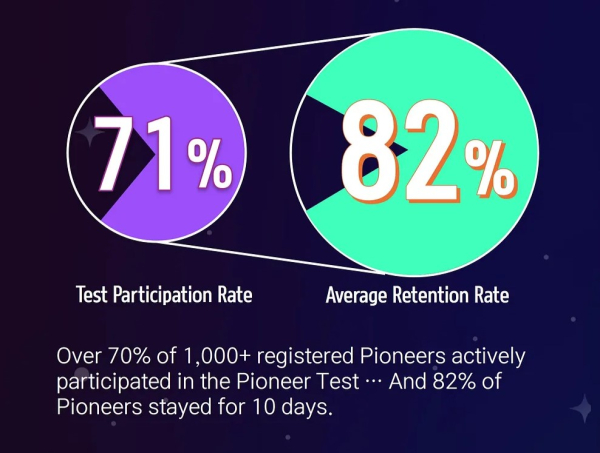 넥스페이스는 이번 파이오니어 테스트를 통해 얻은 여러 지표들을 최근 공개했다. 먼저 테스트 참여율은 71%였으며, 평균 리텐션율은 82%를 기록했다. 1천여명 중 71%가 적극적으로 참여했고, 그중 82%가 테스트 기간 내내 접속한 것이다.