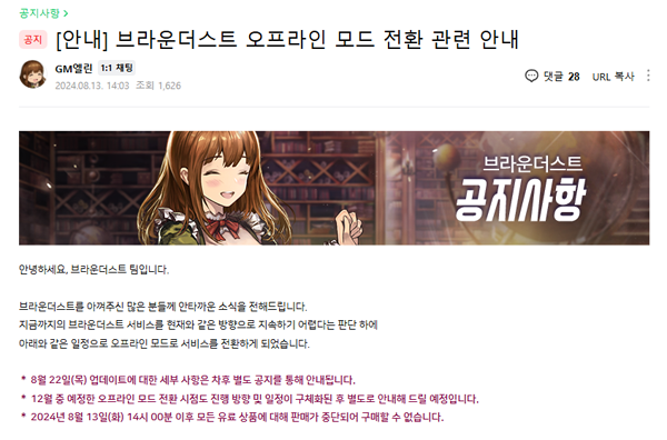 '브라운더스트' 개발진은 13일 공식카페 공지문을 통해 디렉터의 편지와 오프라인 모드 전환 관련 안내 공지로 라이브 서비스 중단 관련 사실을 전했다. 게임은 오는 12월, 오프라인 모드로 전환될 예정으로, 모든 유료 상품 판매 역시 멈춘다.