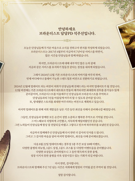 석주선 '브라운더스트' PD는 유저들에게 보내는 편지를 통해 라이브 서비스를 종료 사실과 이후 계획, 유저들에게 감사의 인사를 전했다. 12월에 진행되는 마지막 업데이트에서는 네트워크 연동 기능이 제거되면서 사실상 싱글 모드 전환이 이뤄질 예정이다.