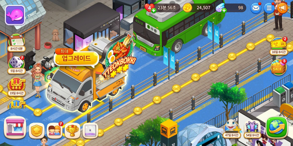 이러한 유료 결제를 피할 수 있는 방법도 있다. 스테이지마다 원하는 미션에 맞는 업그레이드를 진행하는 것이다. 요리 화구나 재료 업그레이드는 모아둔 게임 머니로 진행이 가능하다. 일정 금액의 매출을 원하는 스테이지의 경우, 매출을 높일 수 있는 재료 업그레이드를 진행하면 된다.