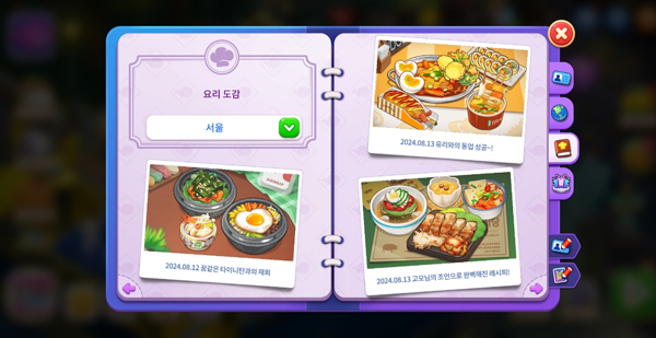 유저들이 첫 플레이에 만나보게 될 서울에서는 비빔밥이나 분식, 고기구이와 같은 한국 대표 음식들을 마주한다. 이어지는 뉴욕에서는 파스타와 햄버거 등을 조리하고 제공할 수 있으며, 발리에서는 나시고랭과 같은 지역적인 특징을 살린 음식 메뉴들이 등장한다.