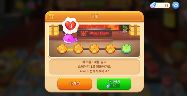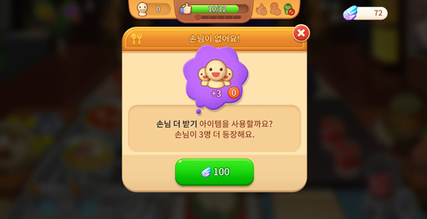 또한, 메뉴 업그레이드와 같은 필수적인 부분에서 요구하는 유료 재화 소진도 유저들의 부담이 될 수밖에 없다. 물론 게임 속에서 무료로 제공되는 유료 재화가 상당하지만, 앞선 플레이로 모두 사용했다면 아이템을 구매할 수 밖에 업다. 다음 스테이지로 결제 없이 넘어갈 수 있는 방법은 1인이 아닌, 2인이 플레이하면 스테이지를 완료할 수 있다.