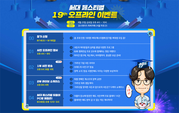 넥슨은 유저들과 끊임없는 소통과 발전을 거듭하며 게임의 장기 서비스를 이어왔다. 올해는 19살 생일을 맞이한 '서든어택' 오프라인 행사를 개최할 예정으로, 8월 23일 서울 마포구 큐스테이지에서 '써대 페스티벌'을 진행한다. 온라인 중계도 동시에 이뤄지면서 유저들의 기대가 커지고 있다.