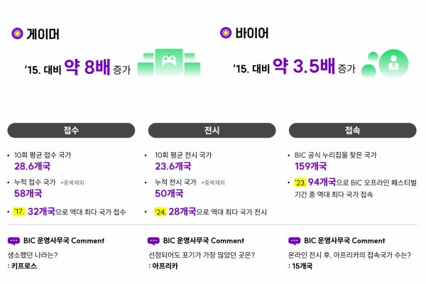 첫 해인 2015년 대비 관람객은 8배가 증가했고, 바이어는 3.5배 증가했다. 매년 28개 이상의 국가가 접수해 매년 23개 국가의 게임이 전시됐다. 올해 전시 국가는 28개국으로 역대 최대다. 그리고 그동안 온라인으로 공식 누리집을 찾은 국가는 159개였다고 한다. 아시아가 29%로 가장 많았고 유럽이 28%, 아프리카가 23% 순이었다.