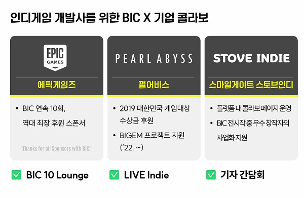 BIC가 인디게임 지원을 위해 다양한 프로모션을 진행 중이다. 2022년부터는 버추얼 유튜버를 앞세워 인디게임을 소개하는 ‘내는존인디’를 선보였고, 2023년에는 스팀 세일 페이지를 통해 좋은 반응을 얻었다. 올해는 오픈스튜디오를 마련해 다국어 스트리밍을 진행하고 있다.