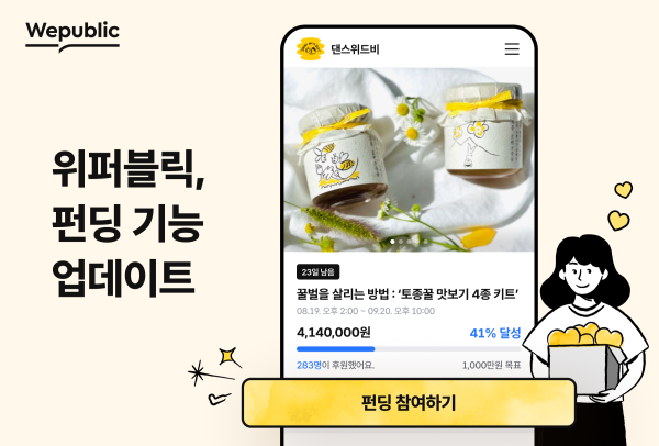 위퍼블릭은 개설자의 원활한 프로젝트 운영과 창작 활동을 지원하기 위해 별도 수수료 없이 서비스를 제공할 계획이다. 또 첫 프로젝트로 꿀벌과의 공존을 위한 펀딩을 시작했다.