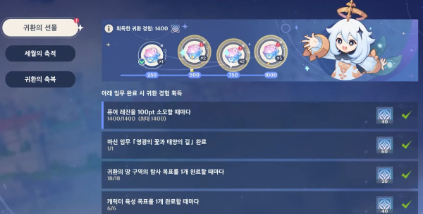 복귀자를 위한 별도의 보상도 마련됐다. 모험 등급 30레벨 이상으로 45일간 로그인을 하지 않은 유저를 대상으로 하며, 별의 귀환 활성화 이후 지정된 임무를 완료하면 기존 보상과 함께 뒤얽힌 인연 10개가 추가로 지급된다.