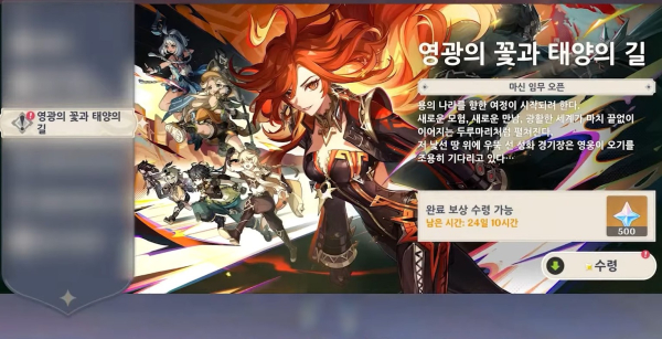 재화도 지급된다. 오는 9월 28일부터 5.0 버전이 종료될 때까지 로그인을 하면 1,600원석, 축성의 서리 1개, 약한 레진 2개를 비롯한 기념 아이템을 받을 수 있다. 1,600원석은 캐릭터 기원(뽑기)을 10회 할 수 있다. 더불어 오는 8월 30일부터 9월 18일 사이에 누적 로그인 7일을 달성하면 뒤얽힌 인연 10개를 보상으로 지급한다.