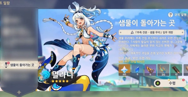 그리고 마신 임무 제 5장 1막과 2막을 완료하면, 임무 보상과 함께 500원석이 추가로 지급된다. 또 부족 견문인 ‘나무살이’와 ‘샘물 무리’를 완료하면 임무 보상과 함께 원석, 캐릭터 돌파 및 육성 소재, 나타 지역 특산물 등의 보상을 받을 수 있다. 단, 특정 기간 내에 완료해야 하며, 빠른 체험 기능 사용 시 신규 마신 임무를 먼저 체험할 수 있다.