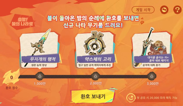 다음으로 나타 탐사 지원 패키지가 지급된다. 이번에 업데이트되는 신규 지역인 ‘나타’의 탐사에 도움을 주는 신규 무기 3종과 돌파 소재를 ‘출발! 불의 나라로’ 웹페이지에 방문하면 지급하는 것. 여기에는 생존 능력을 높여주는 ‘무지개의 행적’, 법구 일반 공격을 하는 ‘약스체의 고리’, 공격력을 대폭 높여주는 ‘대지를 울리는 자’가 있다. 단, 나타 지역은 모험레벨을 28까지는 올려야 한다.