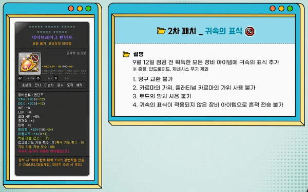또 에픽 등급을 초과하는 에디셔널 잠재능력 강화의 경우 그 효용이 기존 리부트 패시브 효율을 상회, 의도했던 기존 경험을 보존하는 수준을 과도하게 넘어서는 문제도 확인했다는 것이다. 이에 귀속의 표식이 적용된 아이템은 에디셔널 잠재능력 강화를 에픽 등급까지만 가능하게 제한, 의도한 기능을 수행하게 할 예정이다.
