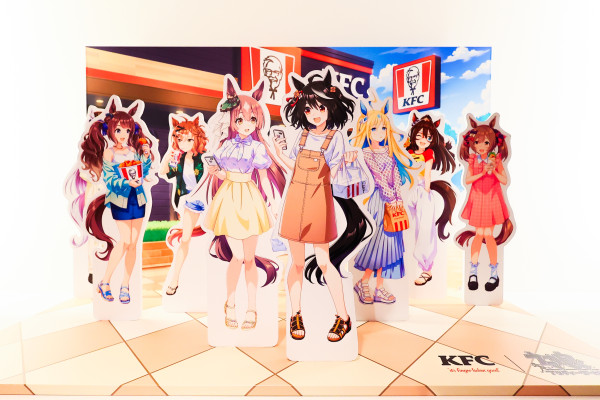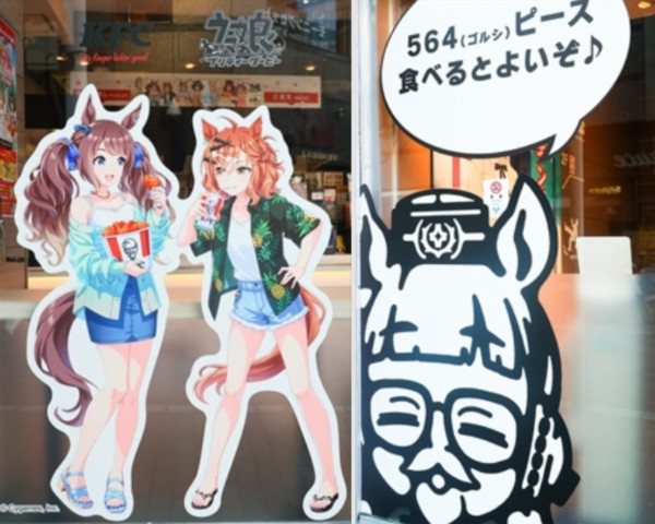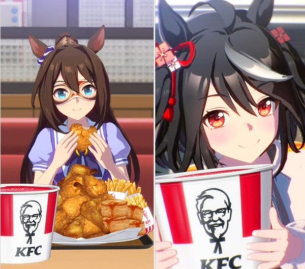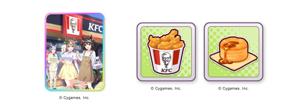 일본에서 서비스 중인 '우마무스메 프리티 더비'와 KFC 협업은 오프라인 매장에서 구입할 수 있는 콜라보레이션 한정 세트(온라인 주문만)의 판매나, 스페셜 에디션 '우마 산포'를 즐길 수 있는 'KFC 산포 캠페인'을 실시한다. 또한, 콜라보레이션 기념 아이템의 배포 등 다양한 이벤트가 준비되어 있다.