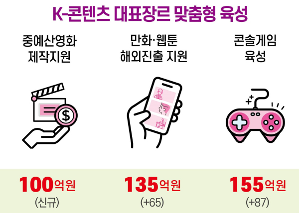 그 외에 문체부는 한국 콘텐츠 산업 전반에 해외 자본 유치를 강화하기 위해, 400억 원 정부 출자를 마중물로 1,000억 원 규모의 ‘글로벌 리그 펀드’를 새롭게 조성한다. 또 콘텐츠 및 연관산업 기업 간 연계망 구축 지원 사업에 3억 원을 새로 배정해 추진한다.
