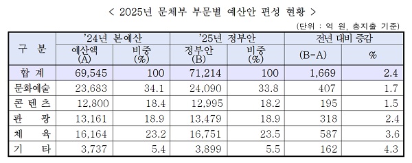 지난 27일 문체부 예산안이 국무회의를 통과함에 따라, 내년에 집행할 문체부의 예산이 총 7조 1,214억 원으로 편성됐다고 28일 밝혔다. 이는 올해 대비 2.4%(1,669억 원) 증가한 것이다.