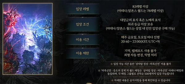 최대 500명의 인원이 발록과 야히 두 진영으로 나누어 벌이는 대규모 콘텐츠다. 기존 월드에서 최소 입장 레벨은 83이며, 아데나와 알폰소 월드는 레벨 78 이상부터 입장 가능하다. 금요일과 토요일에 진행되고, 약 1시간 20분 동안 진행되는데 20분은 준비 시간이다.