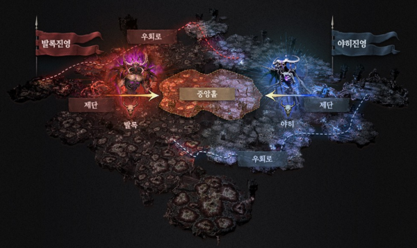 마족신전에 참가한 용사는 중앙 홀로 진입하거나 우회로 중 하나의 공격 루트를 선택하게 된다. 중앙 홀은 마족의 심장과 개인 기여도를 획득하는데 유리한 루트다. 특히, 상대 진영으로 빠르게 진입하여 치열한 전투를 펼치게 된다.