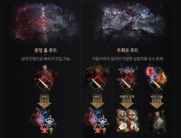 반면, 우회로는 중앙 홀과 비교해 이동 거리는 길지만, 다양한 상호작용이 존재한다. NPC와의 전투를 통해 기여도를 획득하고, 어둠의 상자에서는 특수 주문서 획득, 강력한 효과를 주는 버프 구슬 등 여러 상호작용이 가능하다. 또한, 특수 아이템을 사용해 이동이 가능한 포탈도 존재한다.