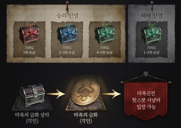 승리와 패배에 따라 보상을 제공하고, 승리 시 마족의 금화 상자와 코인 선택 상자를 추가로 받을 수 있다. 또한, 개인 기여도가 존재해 각 진영에서 기여도 순위 5위 내에 포함되면 보상으로 마족신전 6시와 12시에 위치한 핫스팟 사냥터 입장 기회를 얻을 수 있다.