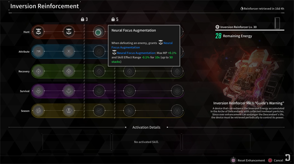 본격적인 스토리 라인의 확장과 함께 계승자들을 더욱 강력하게 만들 성장 콘텐츠도 시즌1에서 등장한다. '역배열 강화기'는 매 시즌별로 계승자를 성장시킬 수 있는 콘텐츠로, 사냥과 속성, 회복, 생존, 시즌 다섯 가지 타입을 취향에 맞게 개방할 수 있다.