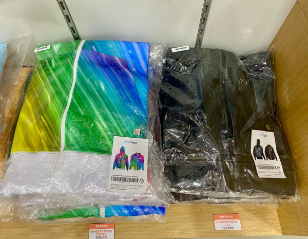 인기 캐릭터 디자인이 새겨진 티셔츠, 이불 담요, 수건, 배지, 마우스 패드 등 다양한 굿즈들이 전시되고 있다.