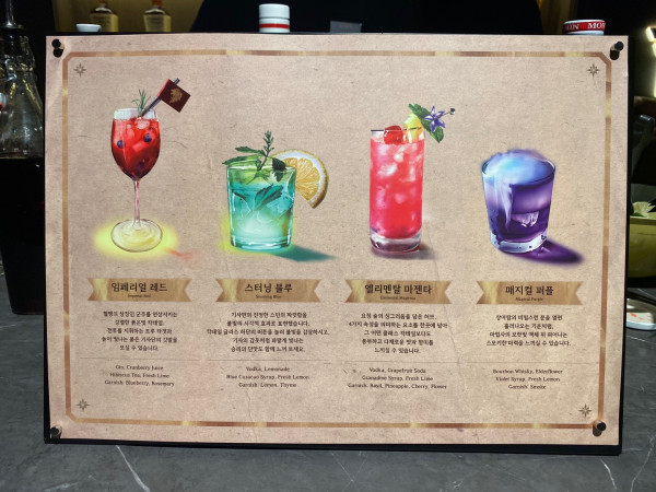 휴식공간에는 4가지의 음료수가 준비돼 있다. 혈맹의 상장인 군주를 연상시키는 '임페리얼 레드', 기사만의 진정한 스턴의 짜릿함을 느낄 수 있는 '스터닝 블루', 요정 숲의 싱그러움을 담은 허브 '엘리멘탈 마젠타', 마법사의 보라빛 액체 위에 피어나는 스모키한 마력의 '매지컬 퍼플'이 있다.