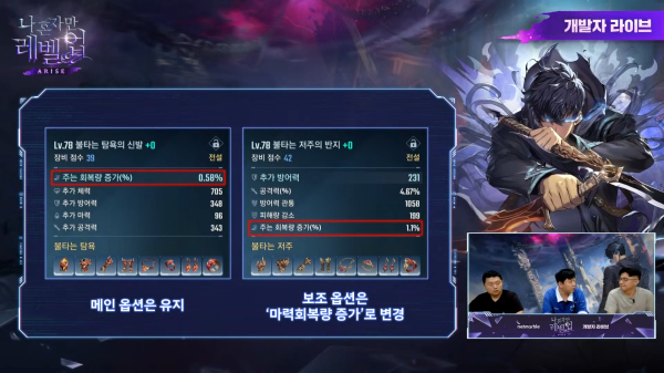 주는 회복량의 변경 시기에 대해서는 “메인 옵션의 주는 회복량 증가는 유지, 보조 옵션의 주는 회복량 증가는 마력 회복량 증가로 바뀐다”고 밝혔고, 성진우가 너무 약하다는 지적에는 “원작에서 제주도 레이드와 악마왕 바란 등을 통해 계속 강해지는 게 성진우다. 그에 맞춰 추가 성장을 포함해 다방면의 성능 강화를 검토 중이며, 제주도 레이드 업데이트를 목표로 준비 중”이라고 밝혔다.