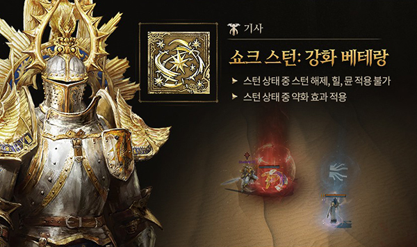 ▲기사는 적에게 치명적인 기절 상태를 부여하는 '쇼크 스턴(강화 베테랑)'을 사용한다. 기절한 상대는 스턴 해제를 비롯해 이뮨 투 함, 힐 지원을 받을 수 없다. 또한, 생존기 스펠도 사용할 수 없으며 물리 방어력과 근거리 회피력, 데미지 리덕션 수치를 대폭 낮아진다.