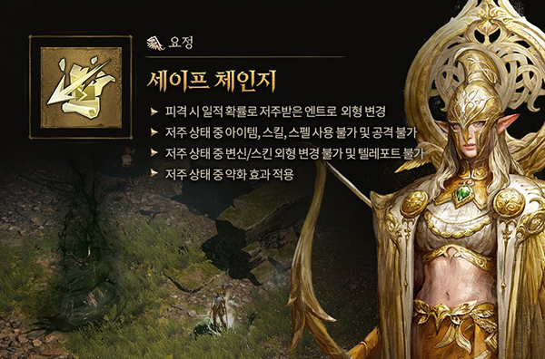▲요정의 '셰이프 체인지'는 대상에게 저주를 걸어 피격 시 일정 확률에 따라 저주받은 엔트로 변화시킨다. 저주 상태에서는 귀환, 스킬 및 스펠, 아이템 등을 모두 사용할 수 없다. 또한, 변신이나 스킨 외형도 변경할 수 없으며, 텔레포트도 불가능하다. 게다가 이동 속도 하락과 함께 물리 방어력과 근거리/원거리 회피력, 데미지 리덕션 수치 등이 모두 하락한다.