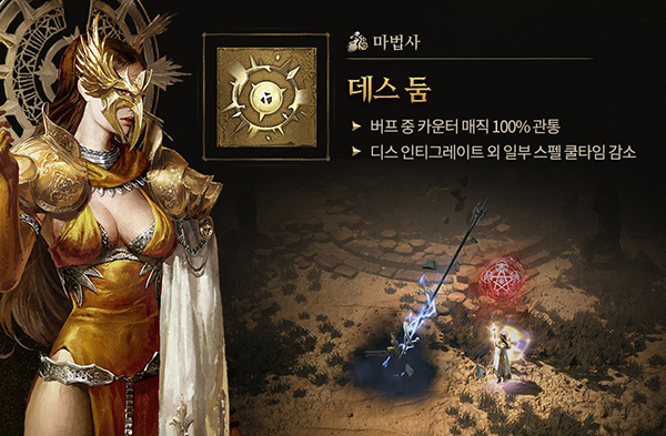 ▲마법사의 신화 스펠 '데스 둠'은 이름 그대로 대상에게 한계를 초월하는 궁극의 마법으로 죽음을 선사한다. 버프 중에 카운터 매직 100% 관통 효과를 부여하고, 디스인티그레이즈, 포그 오브 슬리핑, 미티어 스트라이크, 데스힐, 데스힐(에이전트) 등의 쿨타임이 감소한다.