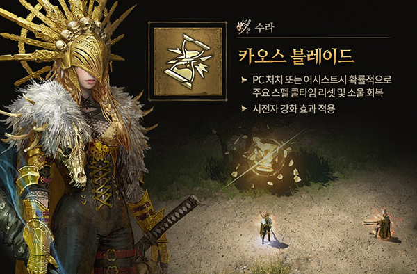 ▲수라의 '카오스 블레이드'는 소울 회복 효과를 가졌다. 다른 유저를 처치하거나 어시스트하면 소울 아밍, 길로틴, 길로틴: 어비스, 소울번 등의 스펠 중 하나의 쿨타임이 리셋되어 추가로 사용할 수 있다. 또한, '카오스 블레이드'를 사용한 수라는 근거리 회피 무시와 근거리 데미지 수치가 일정량 상승하는 버프를 받는다.
