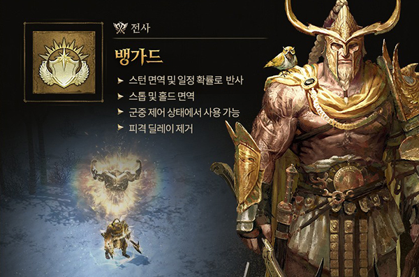 ▲전사의 '뱅가드'는 여러 능력에 면역을 자랑한다. 대표적으로 스톱, 스턴, 홀드, 피격 딜레이에 면역이 생긴다. 또한, 스턴을 일정 확률로 반사하고, 행동 제약 중에도 사용할 수 있다.