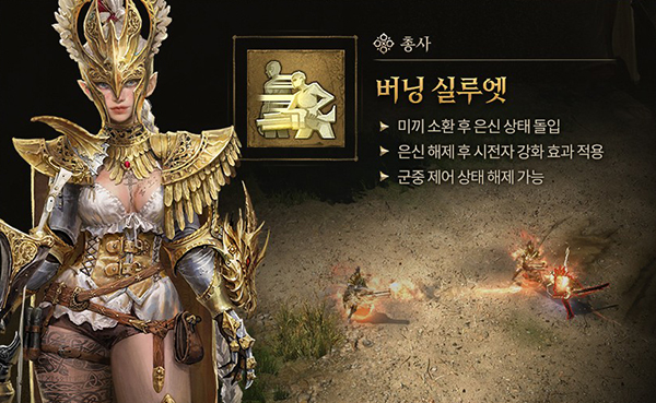 ▲총사는 미끼 용도의 환영을 소환하고, 은신하는 '버닝 실루엣'을 사용한다. 행동 제약 중에도 사용 가능하며, 은신이 해제되면 시전자 강화 효과가 적용된다. 물리 방어력, 원거리 데미지, 이동 속도, 원거리 회피 무시, 원거리 치명타 등 다양한 스탯 상승 효과가 부여된다.