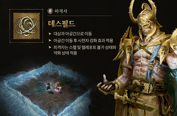 ▲마격사는 '데스 필드'를 통해 대상 1명을 다른 차원의 아공간으로 데려간다. 이곳에서 마격사는 물리 방어력 무시, 마법 명중, 마법 데미지, 마법 증폭력 스탯이 일제히 상승한다. 반면 대상은 텔레포트, 스킬, 스펠을 사용할 수 없으며 이동 속도 감소와 물리 방어력 수치도 하향된다.