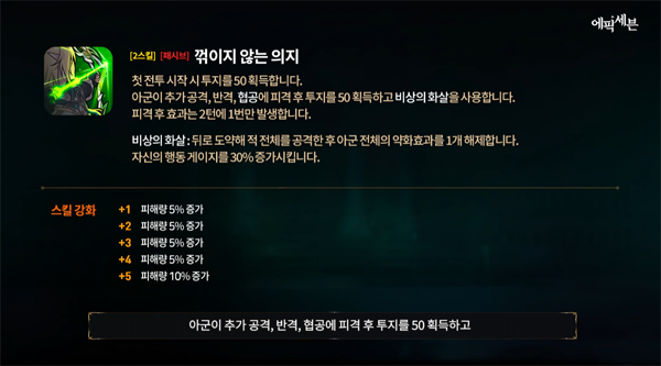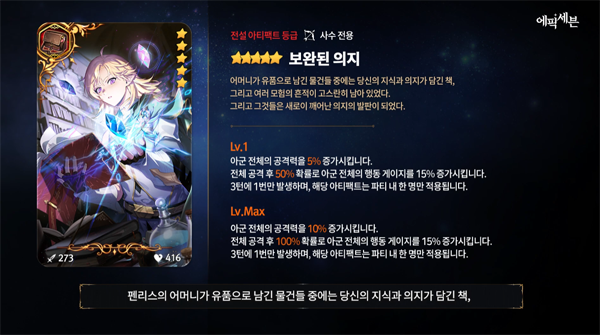 이와 함께 전설 아티팩트 '보완된 의지'는 아군 전체의 공격력을 증가시키는 동시에, 전체 공격 후 높은 확률로 아군의 행동 게이지를 15% 증가시킬 수 있는 효과를 가지고 있다. 행동 게이지 증가 효과로 인해 다양한 조합과 전략에서 좋은 구성을 보여줄 것으로 예고돼 기대가 모아지는 영웅이다.