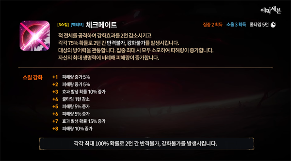 높은 생명력과 속도를 바탕으로 독특한 상태 이상을 바탕으로 한 스킬들이 다양하게 배치되어 있어, 꾸준한 연구와 활용이 요구되는 캐릭터다. 특히 3스킬 '체크메이트'는 전체 공격 이후 강화 효과 감소와 변격 불가, 강화 불가 등을 일으키기 때문에 적의 전략적인 움직임을 깰 수 있는 용도로 활용할 수 있다.