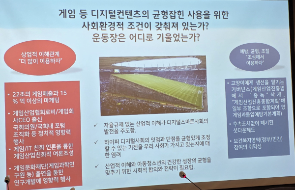 또한 실증 연구를 통해 합의된 기준이 없다 보니 게임을 죄악시하는 곳에서는 유병률이 더 높을 수 있다는 부분도 지적했다. 과거 셧다운제로 많은 사회적 비용을 소모한 것보다 이 이슈가 훨씬 규모가 크다는 예상이 있는 만큼 명확한 근거가 확보되어야 하고, 충분한 연구와 논의 및 검증이 필요하다고 언급했다.