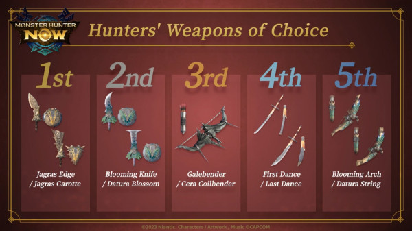 또한 헌터랭크 100 이상의 헌터가 가장 많이 사용한 무기는 게일혼보우 / 각왕궁게일혼이며, 뒤이어 블룸아치와 다추라스트링이 꼽혔다.