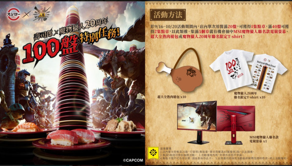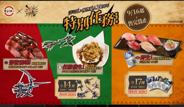 <스시로 × 몬스터 헌터>는 20주년을 맞이해 콜라보레이션 스토어르르 런칭한다. 9월 16일(월)부터 대만에서 시작되며, 10월 20일(일)까지 35일간 이어진다. 대만 스시로 클럽에서 「초밥 100 플레이트 챌린지」집결 포인트 활동을 시작하고, 한정판 굿즈와 '몬스터 헌터' 메뉴가 동시에 선보인다.