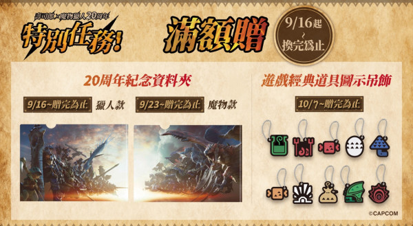 특히 기념 폴더, 소품, 미니 부적 등을 증정하고, 대만 전역에서도 북부, 중부, 남부에 '몬스터 헌터' 테마로 동시에 진행한다.