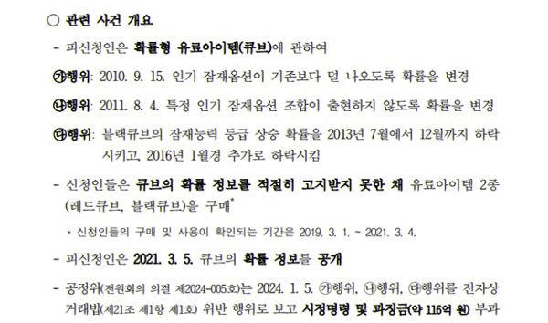 조정위원회는 지난 8월 13일, '메이플스토리' 내에서 발생한 확률형 유료아이템에 대한 조정 결정 내용을 고지했다. 넥슨이 유저들에게 확률형 아이템의 확률을 적절히 고지하지 않고 임의로 변경했다고 보고, 과징금 116억 원과 조정 신청인들에게 일정 비율(레드큐브 사용액의 3.1%, 블랙큐브 사용액의 6.6%)의 보상을 환급해 줄 것을 결정했다.